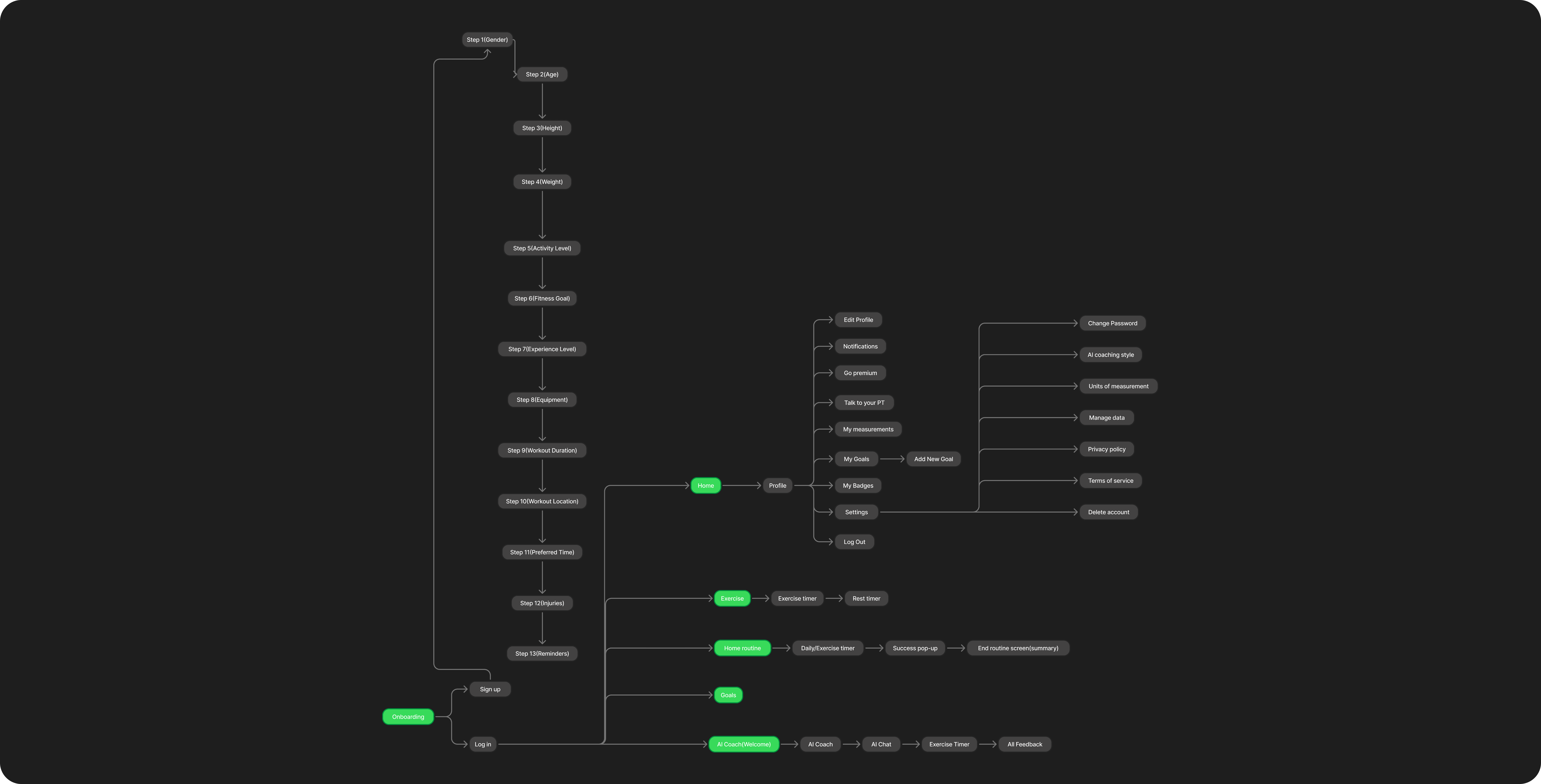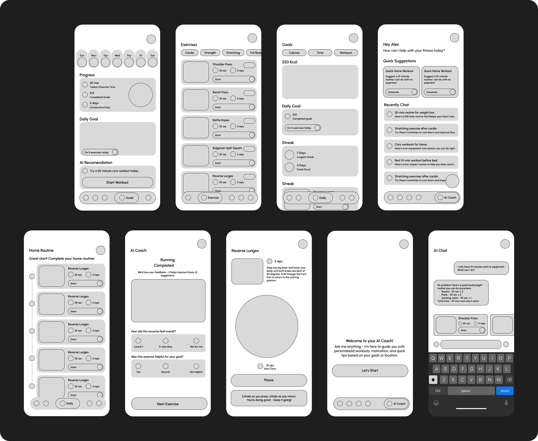 We began by mapping out key user flows, including workout generation, session tracking, AI chat, and progress review. Wireframes focused on clear hierarchies, intuitive navigation, and modular layouts that could flex as more features were added. Once approved, these wireframes evolved into high-fidelity mockups aligned with the visual identity.