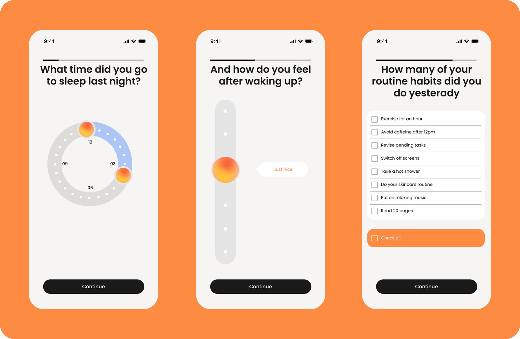 Two core hypotheses guided usability testing. First, we believed that framing sleep around energy gain rather than simply rest would increase student motivation to adopt new routines. Second, we hypothesized that integrating daily accountability mechanisms (such as three-question check-ins) would drive consistency and reduce reliance on willpower alone. Testing confirmed both: users reported being more engaged when they could connect sleep to productivity outcomes, and daily prompts successfully prevented many from late-night phone use. Feedback also highlighted the value of personalization, with students preferring routines that matched their academic and social schedules.
