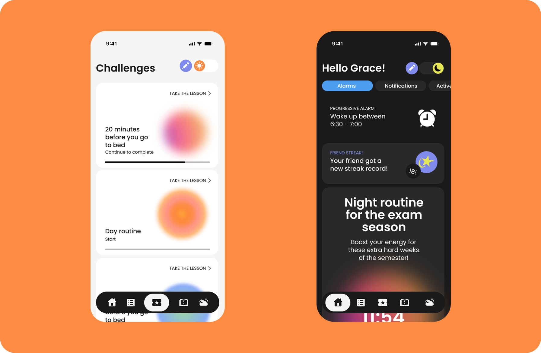 The app’s design focuses on bright gradients, fluid motion, and playful typography to resonate with younger users. Colors are bold but soothing, balancing the energy of Gen Z aesthetics with the calmness needed to represent sleep. The blurred orb visuals symbolize the transition from wakefulness to rest, while the clean UI ensures usability. The app shifts away from typical “health app” cold minimalism and instead embraces warmth, personality, and a touch of fun—key for engaging students who might otherwise ignore sleep advice.