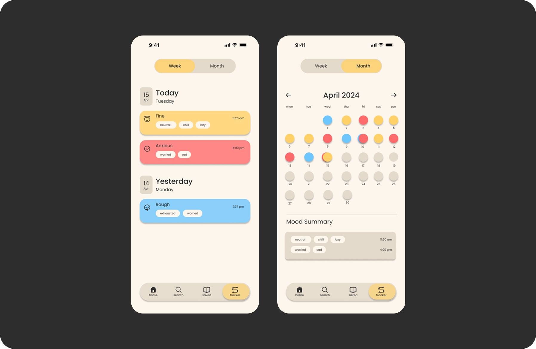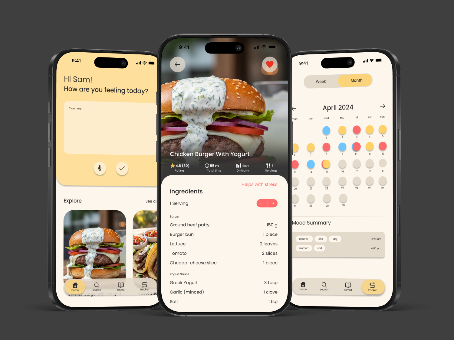MoodBites is an emotion-driven app designed to connect users’ feelings with personalized meal suggestions. Recognizing that food is often tied to mood, the app leverages AI-driven mood tracking to recommend recipes that are not only nutritious but also emotionally supportive. The goal was to design an app that feels empathetic, approachable, and helpful in guiding users to meals that reflect or improve their emotional state.