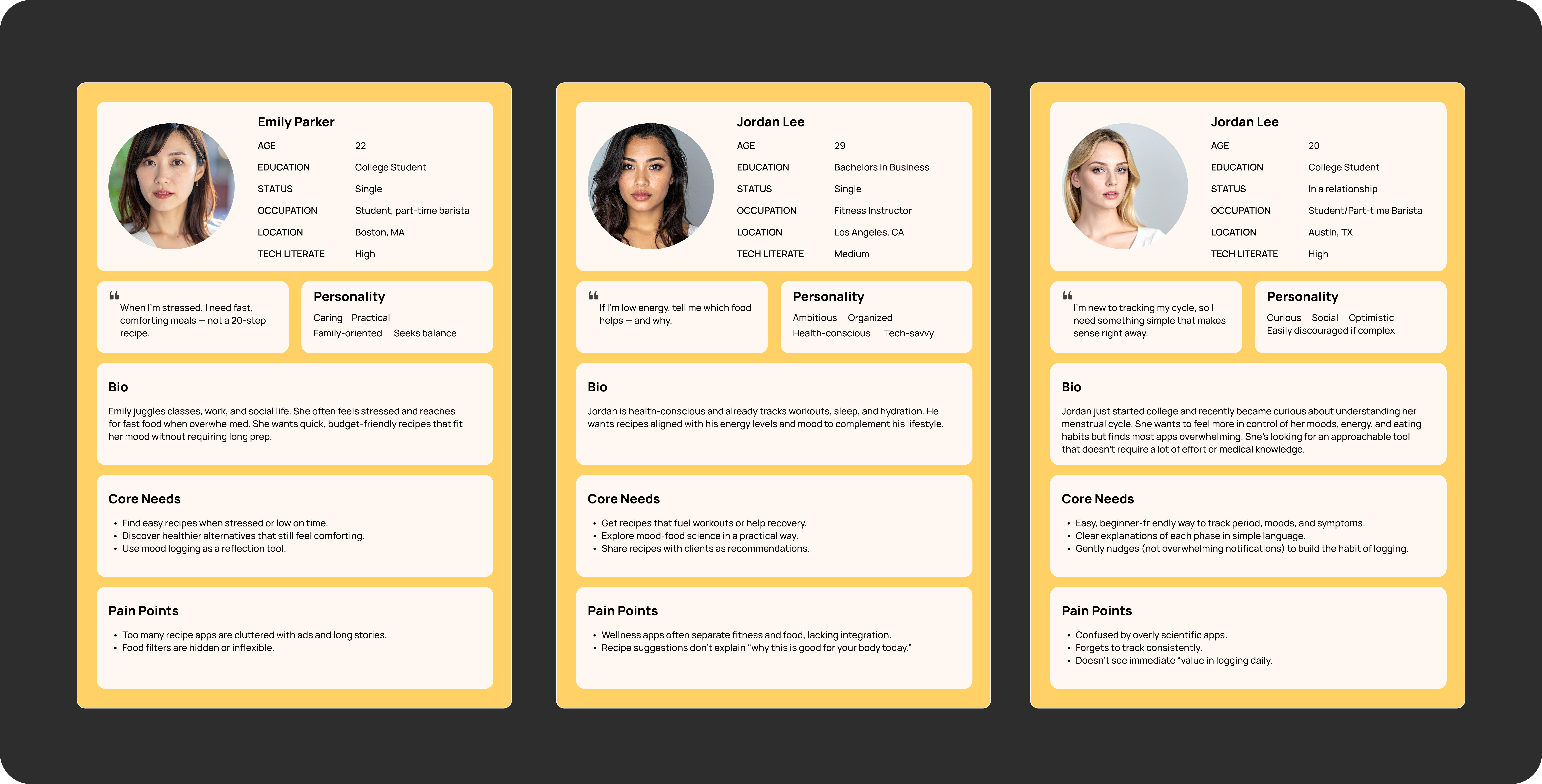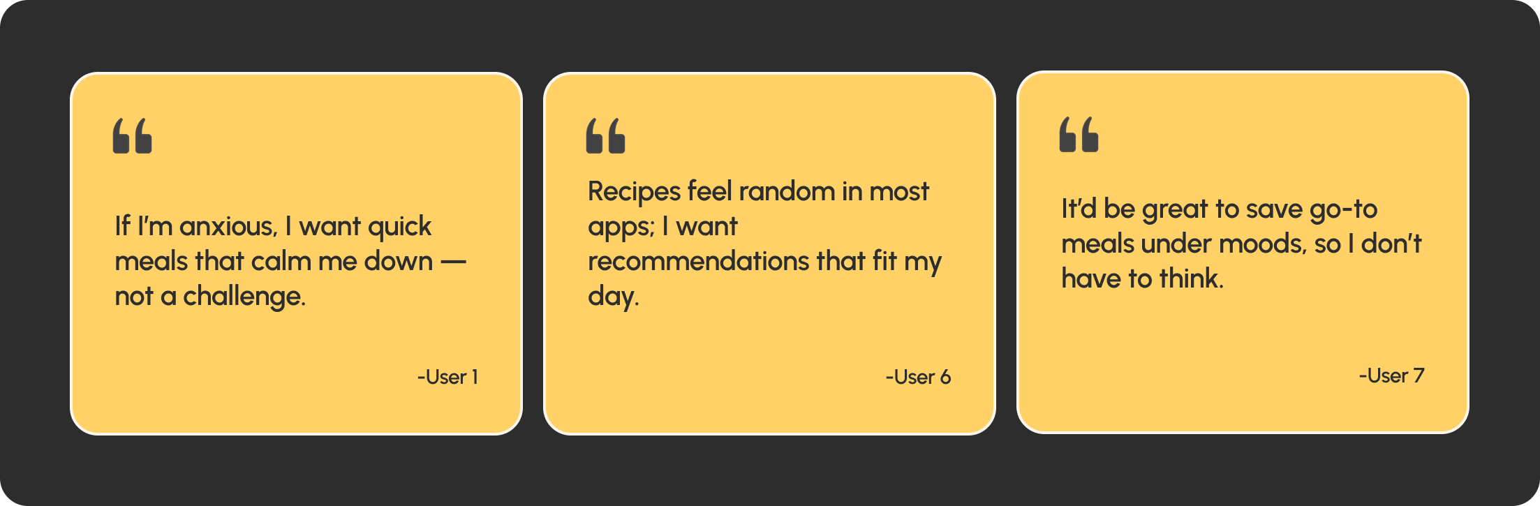 Through competitive analysis, I studied recipe apps like Tasty, Yummly, and Headspace’s mindful eating features. While Tasty excels at quick and engaging recipes, it lacks personalization. Yummly leverages AI but focuses only on flavor and nutrition rather than emotional needs. Headspace connects mindfulness and food but provides no actionable recipes. This revealed a gap for a product that combines personalization, mood-awareness, and ease of use.